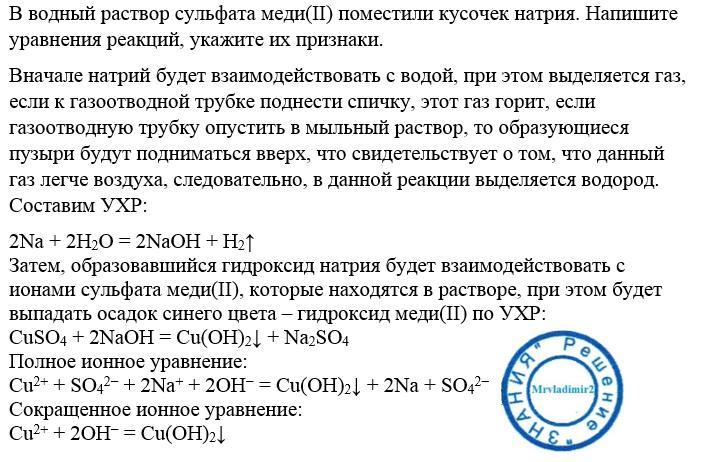 в водный раствор сульфата меди(II) поместили кусочек натрия.напишите уравнения реакций.укажите их признаки