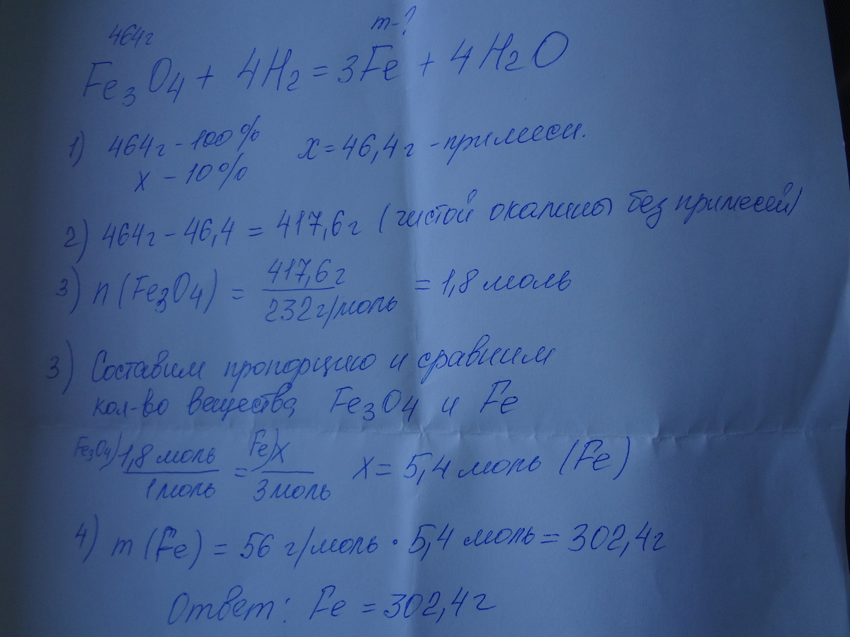 ПОМОГИТЕ ПОЖАЛУЙСТА! СРОЧНО НАДО! Вычислите массу железа, которое можно получить при восстановлении водородом 464 г железной окалины Fe3O4,