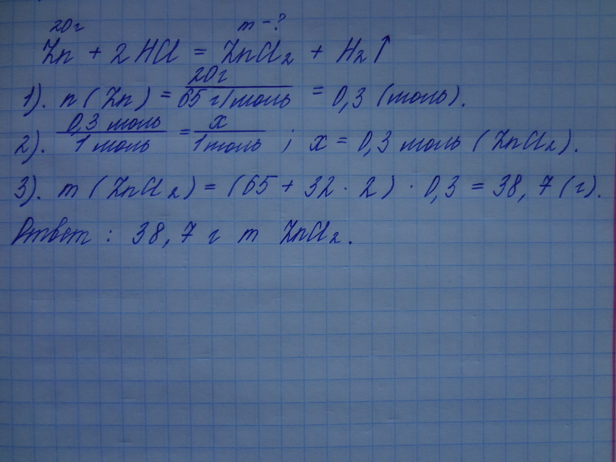 вычислите хлорида цинка образовавшегося при взаимодействии 20 г цинка с соляной кислотой помогите плиз )))
