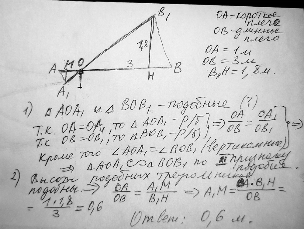 Короткое плечо шлагбаума имеет длину 1 м, а длинное плечо – 3 м. На какую высоту (в метрах) опустится конец короткого плеча, когда конец длинного плеча поднимается на 1,8 м?