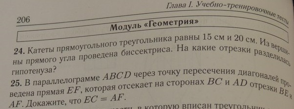 1) Катеты прямоугольного треугольника равны 15 см и 20 см. Из вершины прямоуго угла проведена биссектриса. На какие отрезки разделилась гипотенуза?
