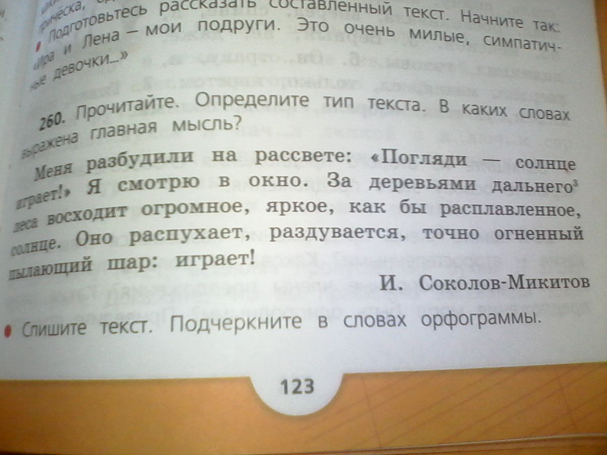 Главная мысль этого текста в словах : Меня разбудили на рассвете .Я смотрю в окно.За деревьями дальнего леса восходит солнце.Оно распухает,точно огненный шар.