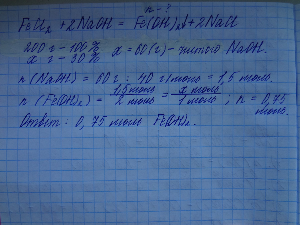 Вычислите количество вещества гидроксида железа, полученного в химической реакции хлорида железа с 200 г раствора гидроксида натрия с массовой долей щёлочи 0,30.