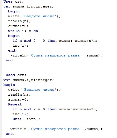 Составить блок-схему и программу, вычисляющую сумму квадратов четных чисел. Использовать цикл с предусловием или с постусловием.
