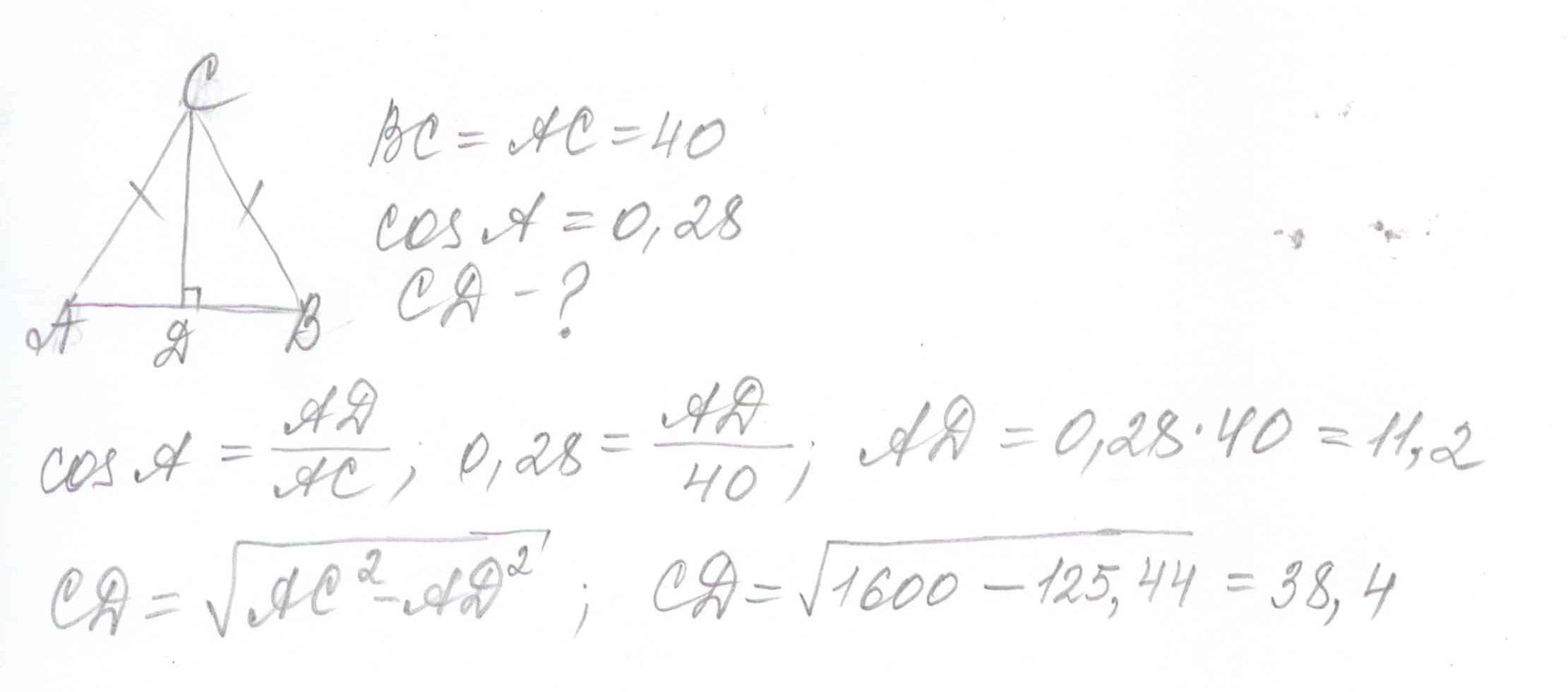 (в равнобедренном треугольнике АВСизвестно что ВС=АС=40.Чему равна высота опущенная на АВ,если cos A=0.28