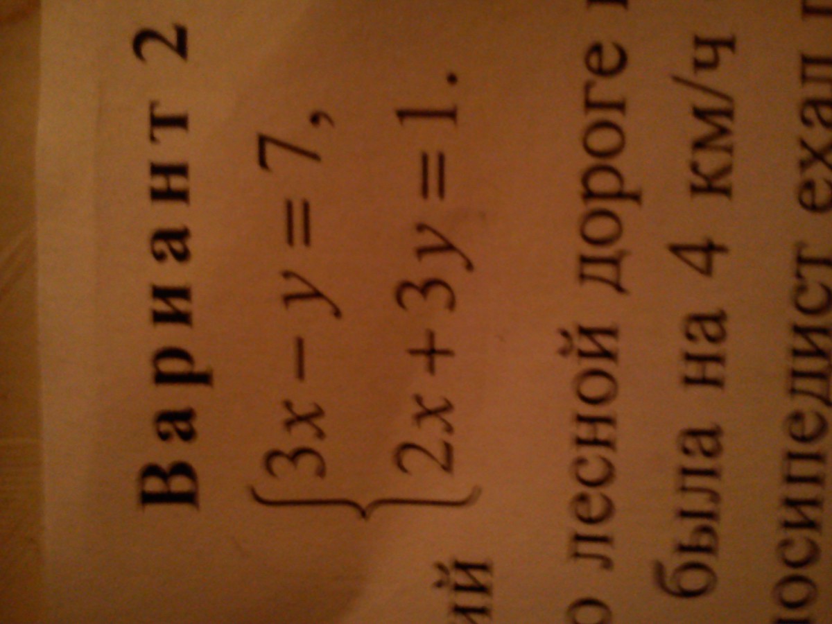 left { {{3x-y=7} atop {2x+3y=1 }} right.  \  \ y=3x-7 \ 2x+3(3x-7)=1 \ 2x+9x-21=1 \ 11x=22 \ x=2 \ y=3*2-7 \ y=6-7 \ y=-1