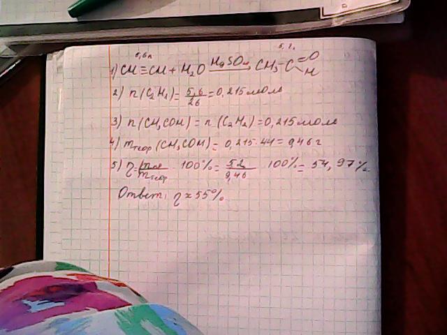При взаємодії 5,6 л ацетилену з водою утворилося 5,2 г оцтового альдегіду. Яка масова частка виходу альдегіду?