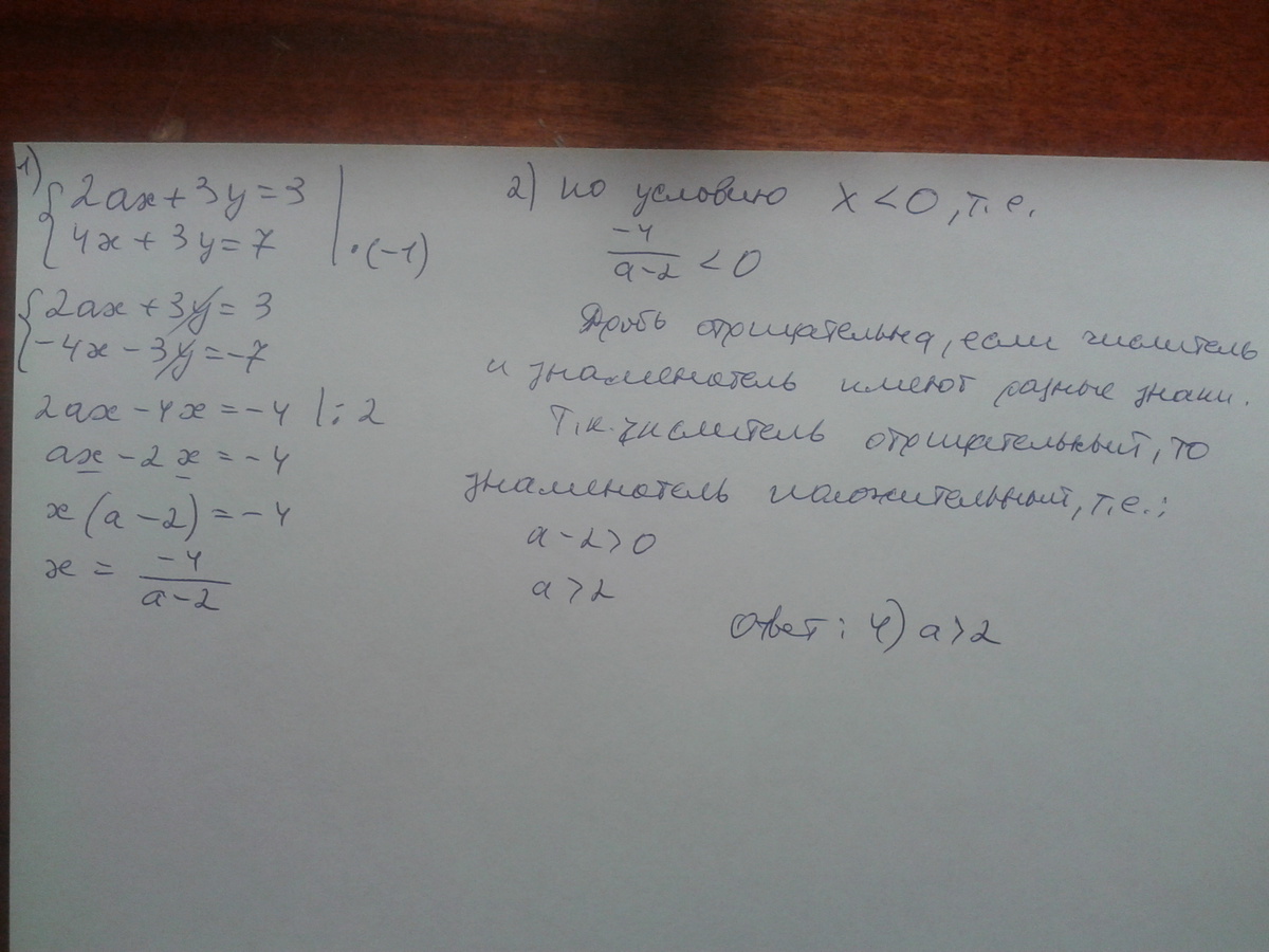 при каких значениях а точка пересечения прямых 2ах+3у=3 и 4х+3у=7 имеет отрицательную абсциссу?