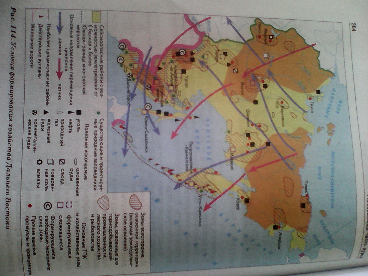 По карте (рис 114) выясните,в каких частях Дальнего Востока наиболее сложные условия проживания. Какие районы высокосейсмичны?