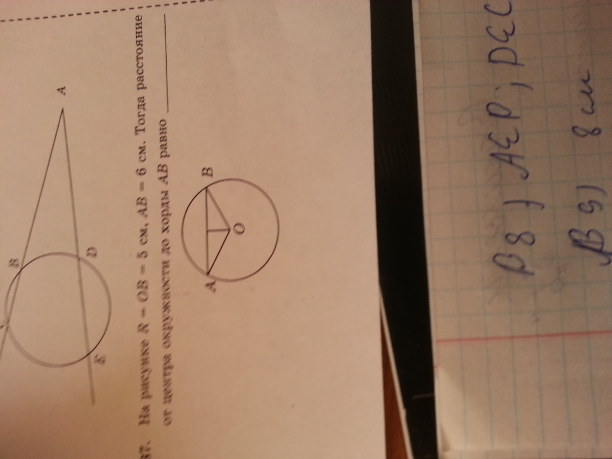 На рисункеR=OB=5 см, AB=6 см .Тогда расстояние от центра окружности до хорды AB равно__________