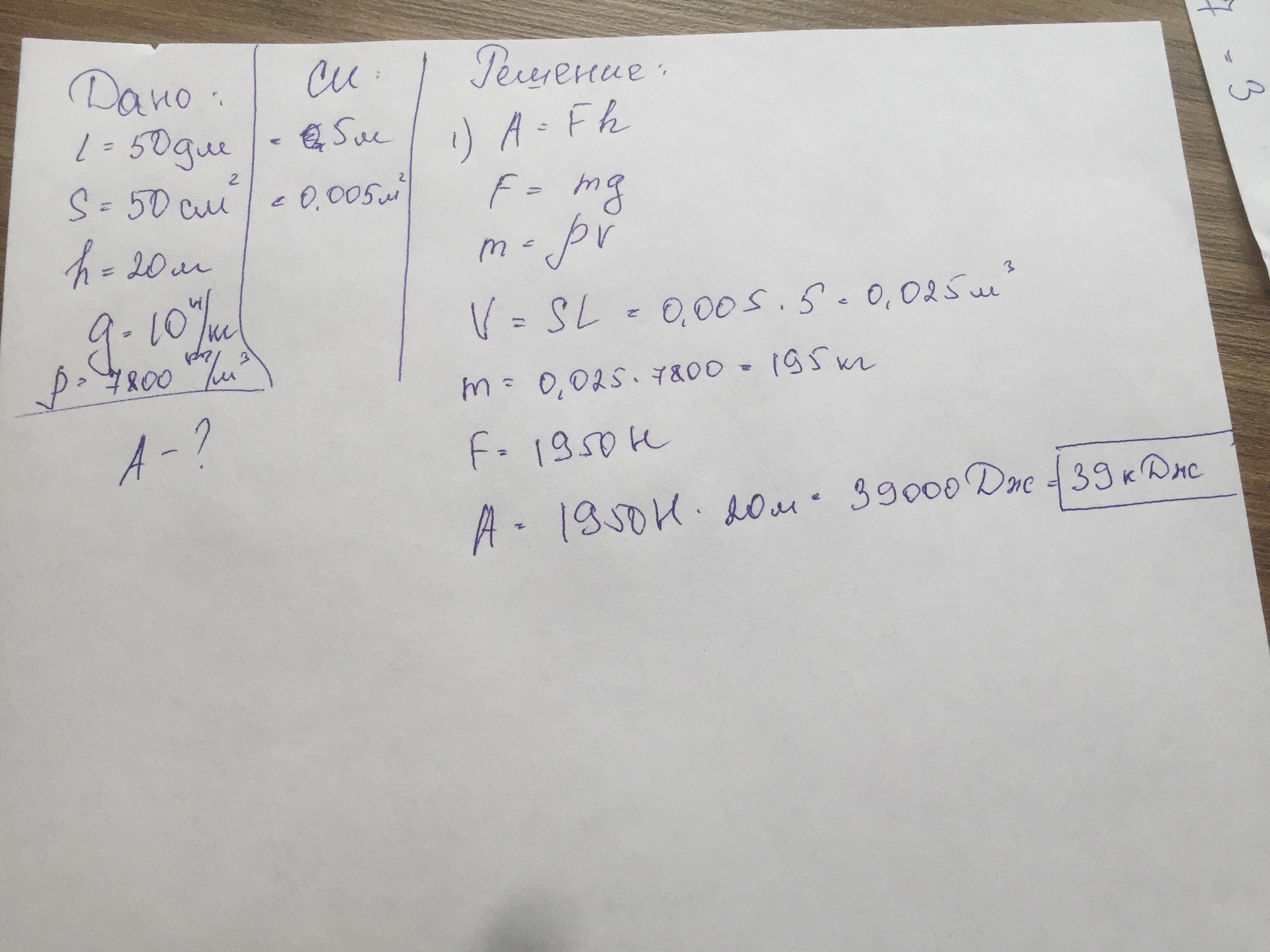 Определите, какая работа совершается при подъеме стальной балки длиной 50 дм и сечением 50 см2 на высоту 20 м?