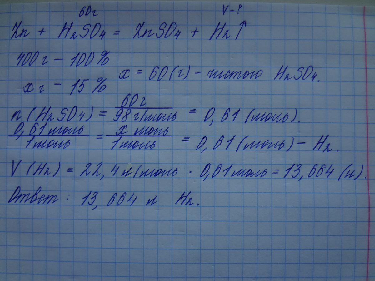 Вычислите объем водорода (ну) выделившегося при взаимодействии достаточного количества цинка с 400 г 15% раствора серной кислоты
