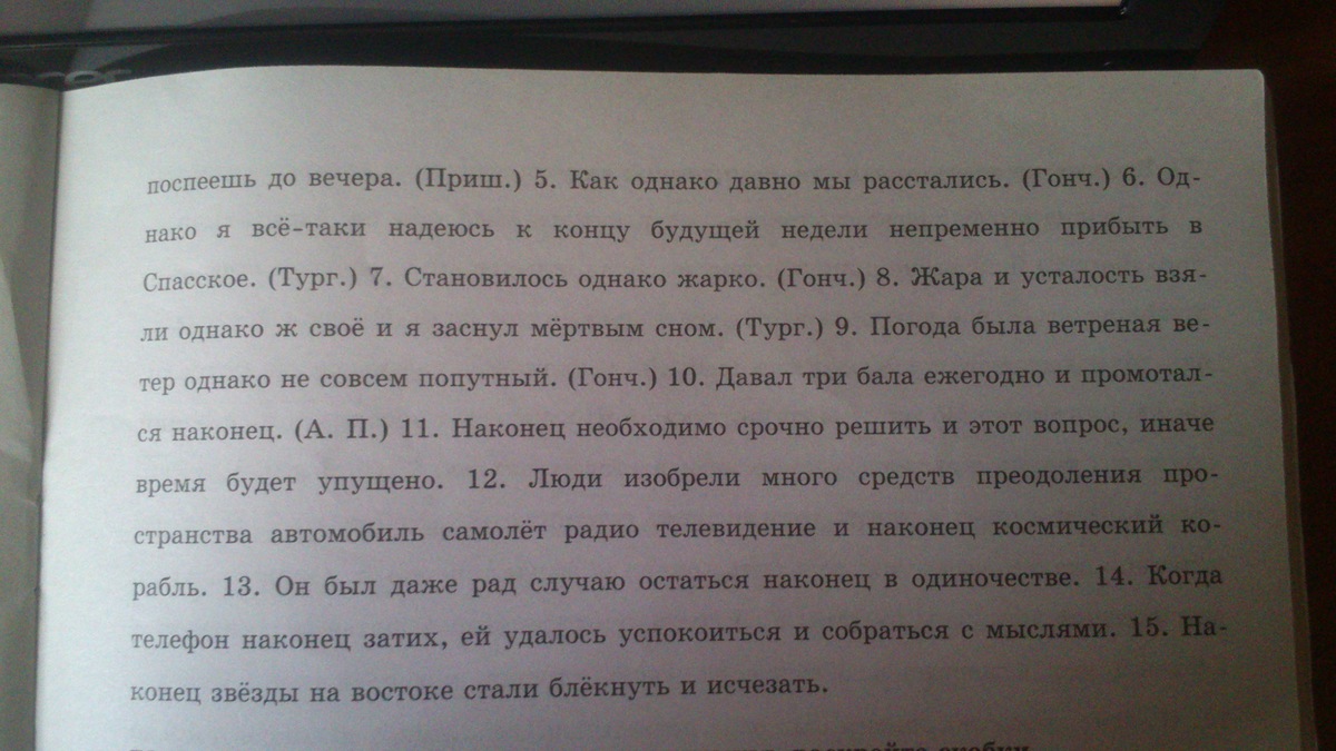 1) Однако нынешней весной все шло как-то не так. 2) Лес поредел, однако дождь, как на грех, усилился. 3) Скоро, однако, лес впереди поредел, проглянула свободная даль. 4) Вся беда, однако, в том, что охота с гончей на лис не всегда удается: то, бывает, лисица понорится, то, бывает, уведет собак в такую даль, что не поспеешь до вечера. 5) Как, однако, давно мы расстались. 6) Однако я все-таки надеюсь к концу будущей недели непременно прибыть в Спасское. 7) Становилось, однако, жарко. 8) Жара и усталость взяли, однако ж, свое, и я заснул мертвым сном. 9) Погода была ветреная, ветер, однако, не совсем попутный. 10) Давал три бала ежегодно и промотался наконец. 11) Наконец необходимо срочно решить этот вопрос, иначе время будет упущено. 12) Люди изобрели много средств преодоления пространства: автомобиль, самолет, радио, телевидение и, наконец, космический корабль. 13) Он был даже рад случаю остаться наконец в одиночестве.14) Когда телефон наконец затих, ей удалось успокоиться и собраться с мыслями. 15) Наконец звезды на востоке стали блекнуть и исчезать