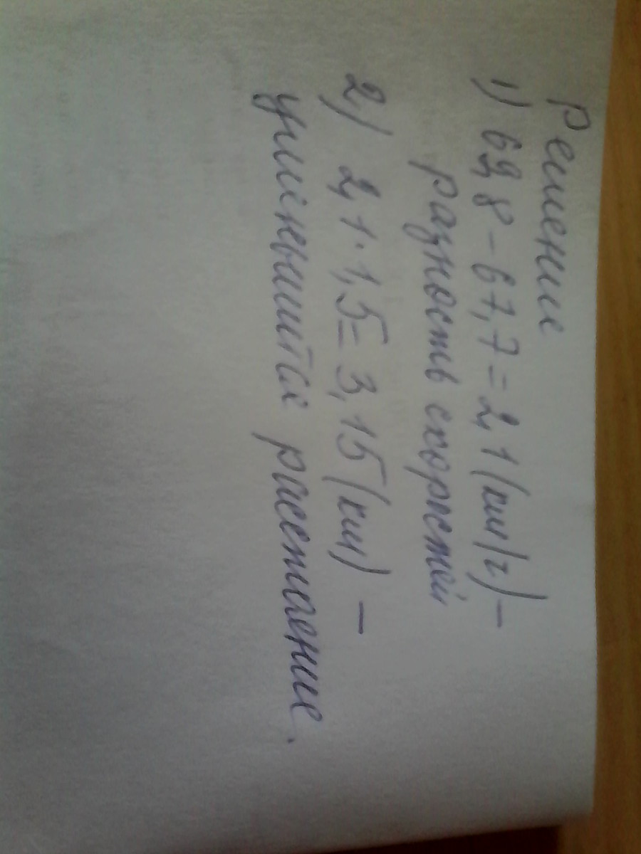 Из двух городов навстречу друг другу выехали два автомобиля. Скорость одного из них 67,7 км/ч, а скорость другого - 69,8 км/ч. На сколько км уменьшится расстояние между автомобилями через 1,5 часа ?