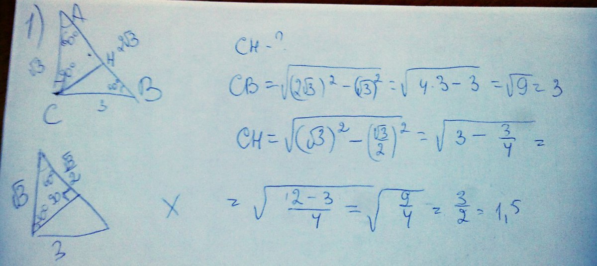 1) В треуг. АВС угол С=90, угол А=60 град, АВ = 2√3, найти высоту СН.