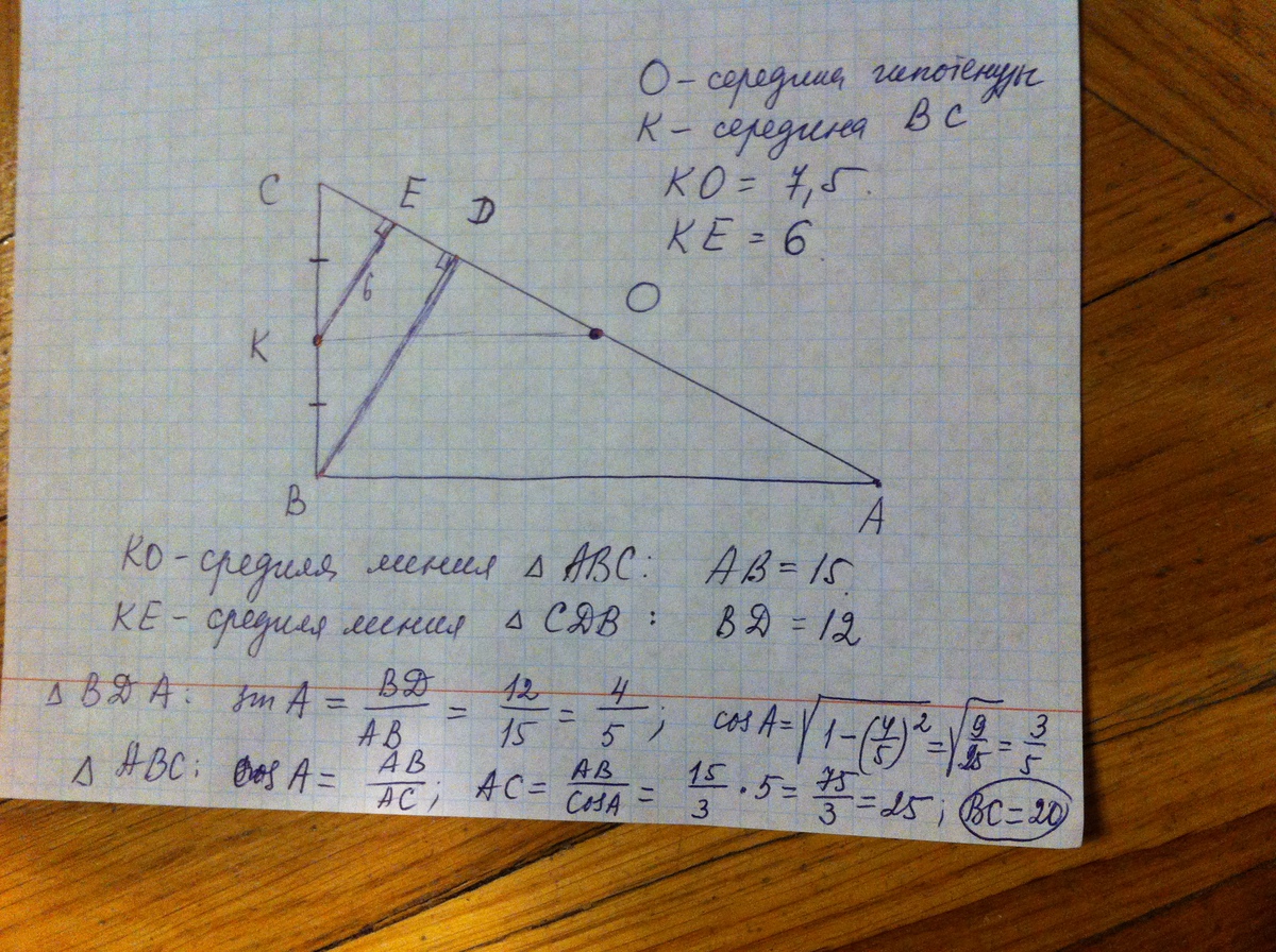 Перпендикуляр, опущенный из середины одного катета на гипотенузу, равен 6 см, а середина гипотенузы отстоит от этого же катета на 7,5 см. Найдите стороны данного треугольника.