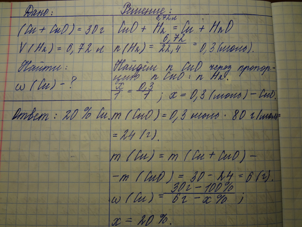 Смесь меди и оксида меди (II) массой 30 г восстановили водородом.Объем затраченного водорода составил 6,72 л (н.у). Вычислите массовую долю меди в исходной смеси. Пожалуйста с дано.