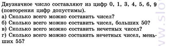 в) На 1 месте любая из 6 цифр, кроме 0. На 2 месте 1, 3, 5, 9 - 4 цифры.