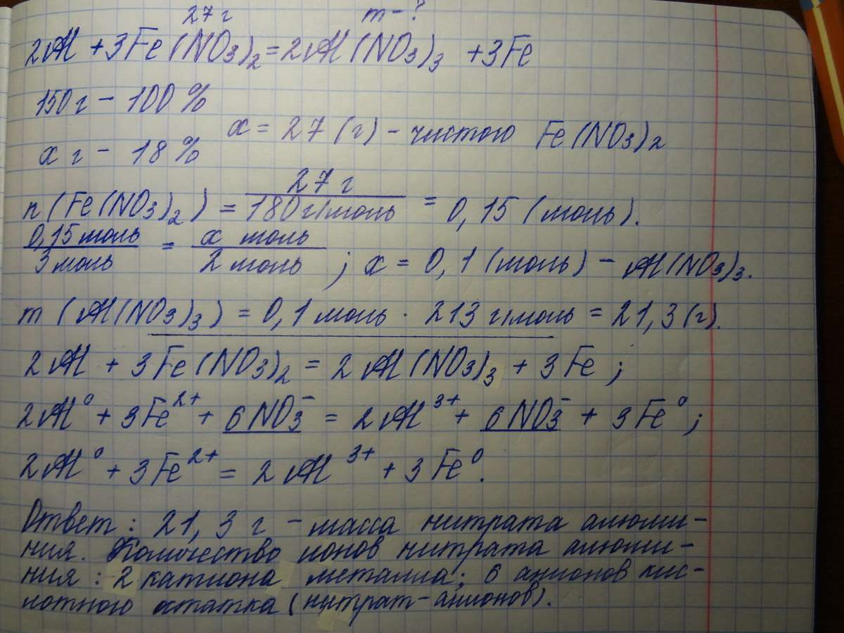 Какая масса соли может быть получена при действии алюминия на 150г 18%-ного раствора нитрата железа(2)? Определите количество ионов этой соли.
