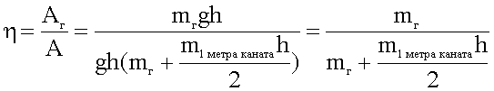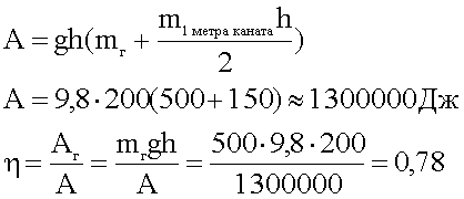 Из шахты глубиной 200м поднимают груз массой 500кг на канате, каждый метр которого имеет массу 1,5кг. Определите КПД установки.