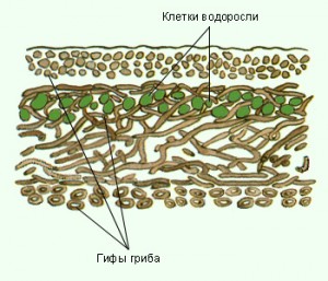 1.Тело лишайника – слоевище состоит из нитей-гифов гриба, в которых заключены одноклеточные зеленые водоросли или цианеи (цианобактерии, старое название – сине-зеленые водоросли). Лишайники рассматривают как симбиотические организмы, где грибы поставляют воду с растворенными минеральными солями, а водоросли осуществляют фотосинтез, обеспечивая поступление органических веществ. Лишайники первыми заселяют безжизненные местообитания, произрастают на голых камнях. Этому способствует их неприхотливость к субстрату, способность переносить длительное высушивание, впитывать атмосферную влагу поверхностью тела. Необходимым условием произрастания лишайников является наличие света, необходимого для фотосинтеза.