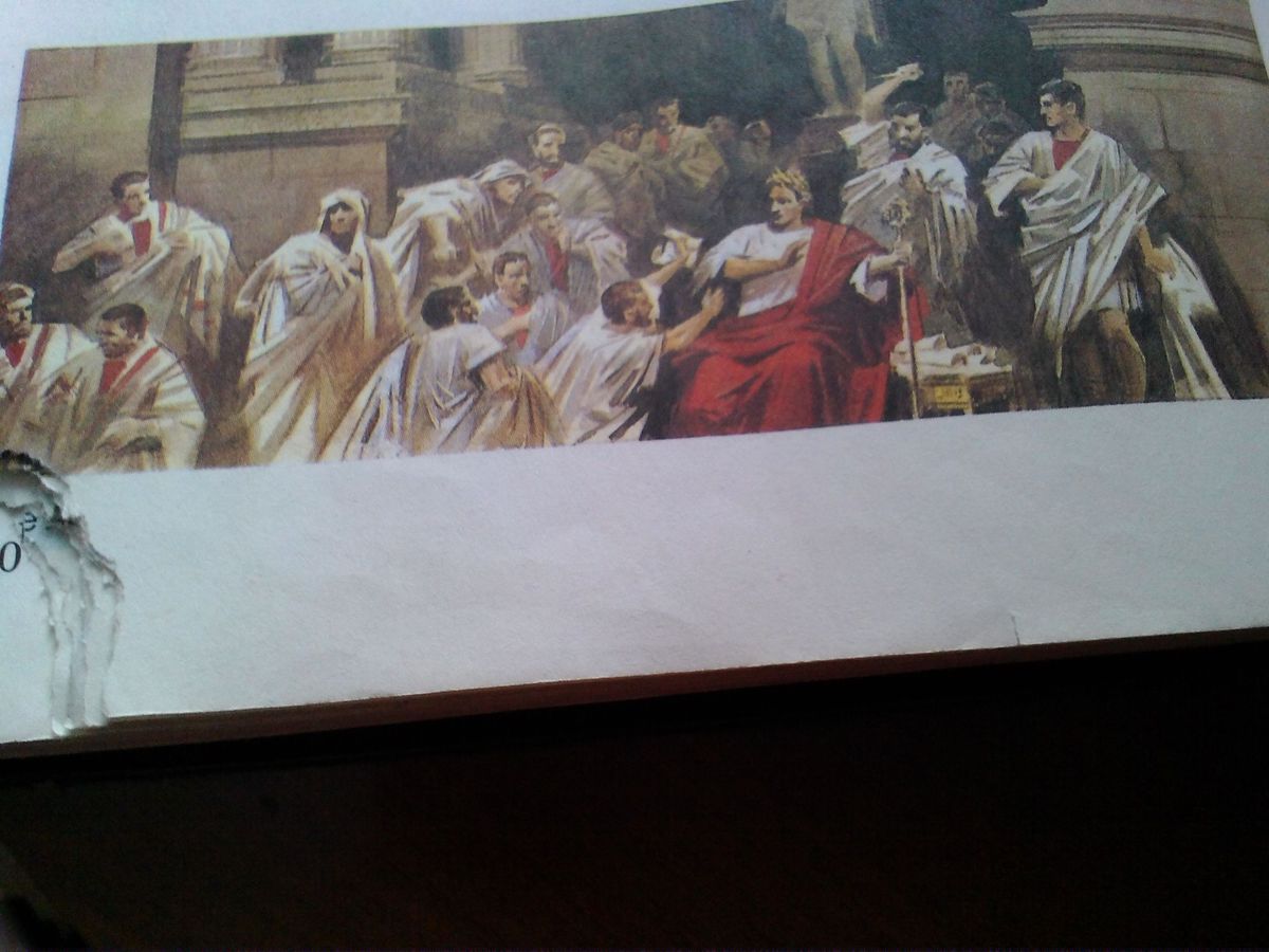Цезарь сидит в зале, окруженный сенаторами, среди которых есть Гай Кассий Лонгин, Марк Юний Брут. Карл Теодор фон Пилоти нарисовал множество сенаторов-заговорщиков вокруг Цезаря, но основных он осветил белым светом. Поэтому их фигуры, и фигура Цезаря видны так отчетливо. По выражению Цезаря видно, что он не ожидал подобного стечения обстоятельств. Цезарь был доверчив и безоружен, потому и убит.