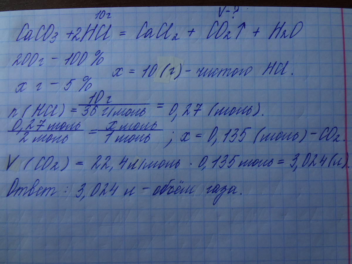 Вычислите объем газа (н.у.), который образуется при взаимодействии мрамора с 200 г 5%-ного раствора соляной кислоты.