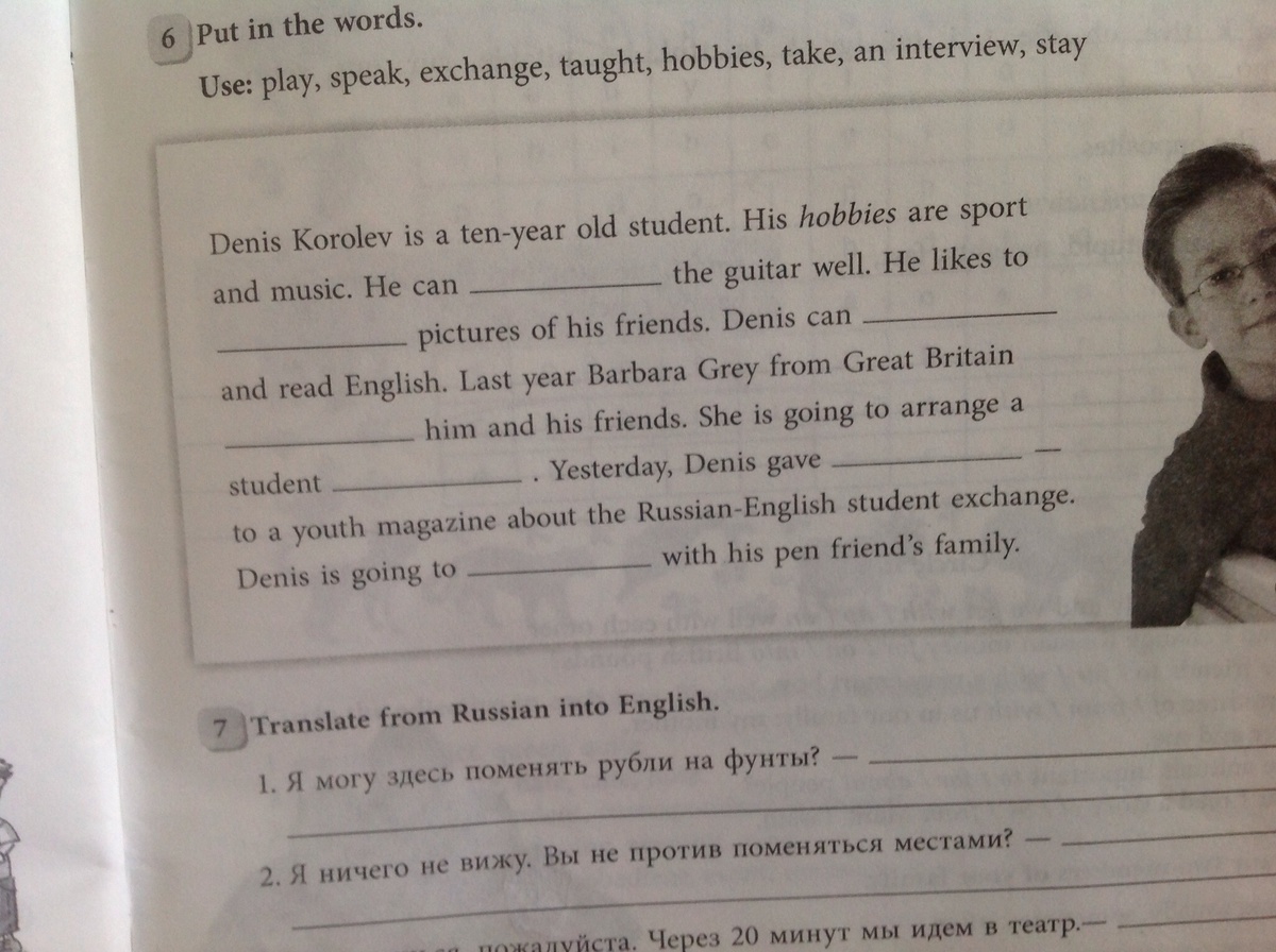 Put in the words. Use play,speak,exchange,taught,hobbies,take,an interview ,stay.