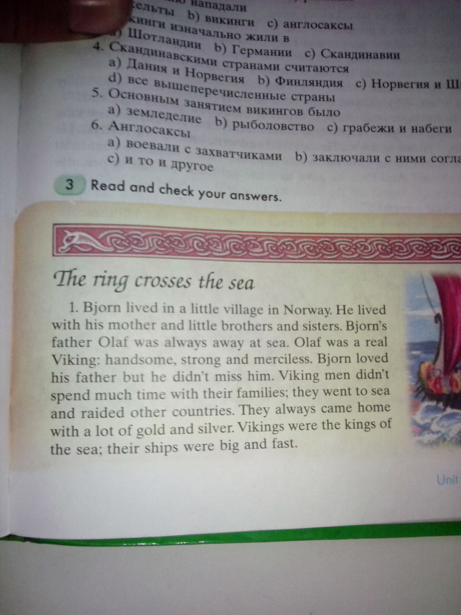 Bjorne жил в маленькой деревне в Норвегии. Он жил со своей мамой и младшими братьями и сестрами. Отец Бьерна - Олаф- был всегда у моря. Олаф был настоящим викингом: красивый, сильный, безжалостный. Бьерн любил своего отца, но он с ним не встречался. Мужчины - викинги не проводят много времени со своими семьями; они уходят в море и грабят другие страны. Они всегда приходят домой с множеством золота и серебра. Викинги были королями моря; их корабли были большими и быстрыми.