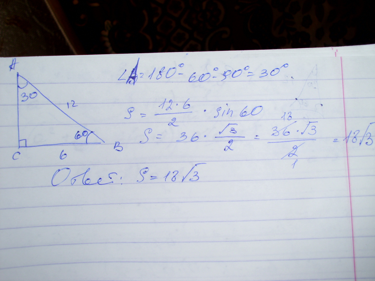 найти площадь прямоугольного треугольника,гипотенуза которого равна 12 см,а один из острых углов равен 60 градусов