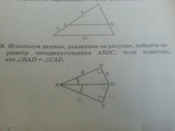 На рисунке черырехугольник диагональю АD разделен на два прямоугольных треугольника, в который гипотенуза АD общая, а прилегающие к ней углы равны.