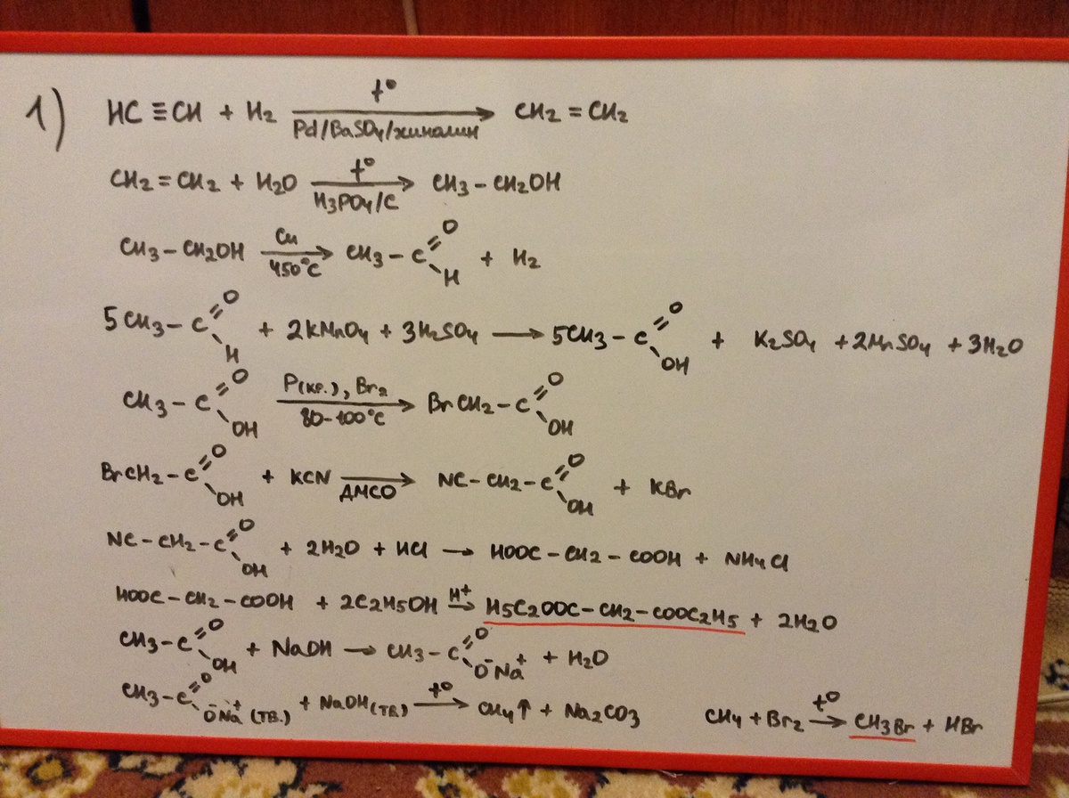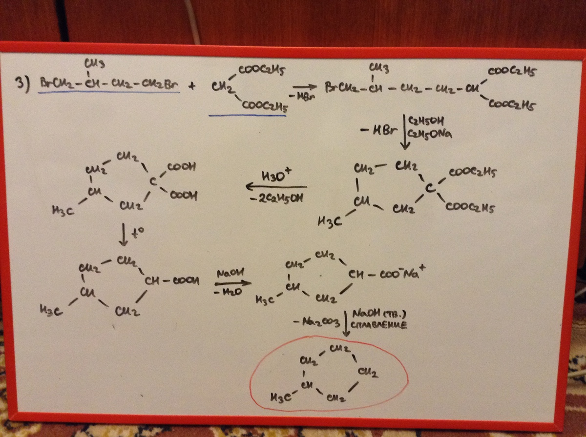 Комментарии: вещества, подчеркнутые красным цветом, - ключевые вещества. Синим цветом подчеркнуты те же вещества (просто как указание, для чего они были нужны). Синтез получился длинным, но все представленные реакции идут с большими выходами (минимум 80%), что прекрасно (в отличие от синтеза дегалогенированием α,ω-дигалогеналкана, который идет с малыми выходами).