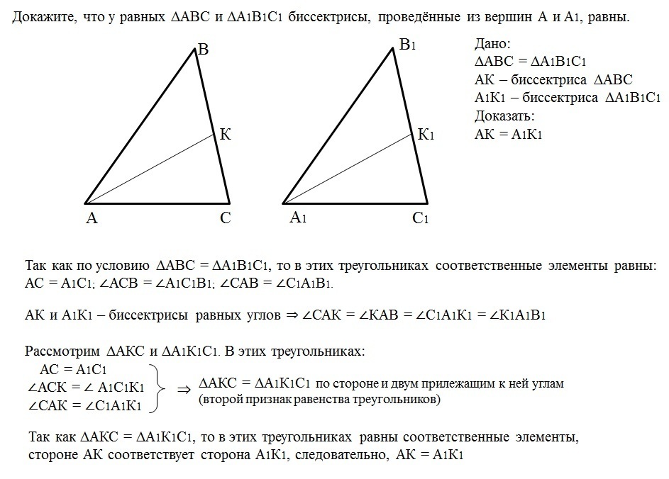 Докажите, что у равных треугольников АВС и А1В1С1 биссектрисы, проведенные из вершин А и А1, равны.