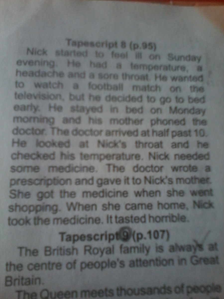 Нику стало плохо в воскресное утро. У него температура, болит голова и горло. Он хотел посмотреть по ТВ футбольный матч, но он решил пораньше пойти спать. Он остался дома в понедельник и его мама позвонила доктору. Доктор прибыл в десять часов. Он осмотрел горло Ника и измерил его температуру. Нику нужны лекарства. Доктор написал нужные лекарства и дал листочек маме Ника. Она купила лекраства, когда ходила по магазинам. Когда мама пришла домой, Ник выпил лекарства. На вкус они показались ему ужасными.
