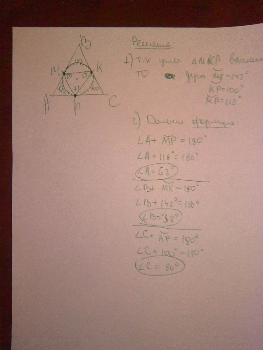 Окружность, вписанная в треугольник ABC, касается его сторон в точках M, K и P. Найдите углы треугольника ABC, если углы треугольника MKP равны 50°, 59° и 71°