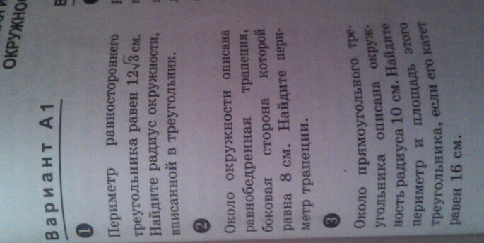 3.радиус -половина гипотенузы. Гипотенуза 2*10=20. второй катет корень квадратный из 20*20-16*16=144 или 12 см. Площадь 1/2 *12*16=96, периметр 12+16+20=58