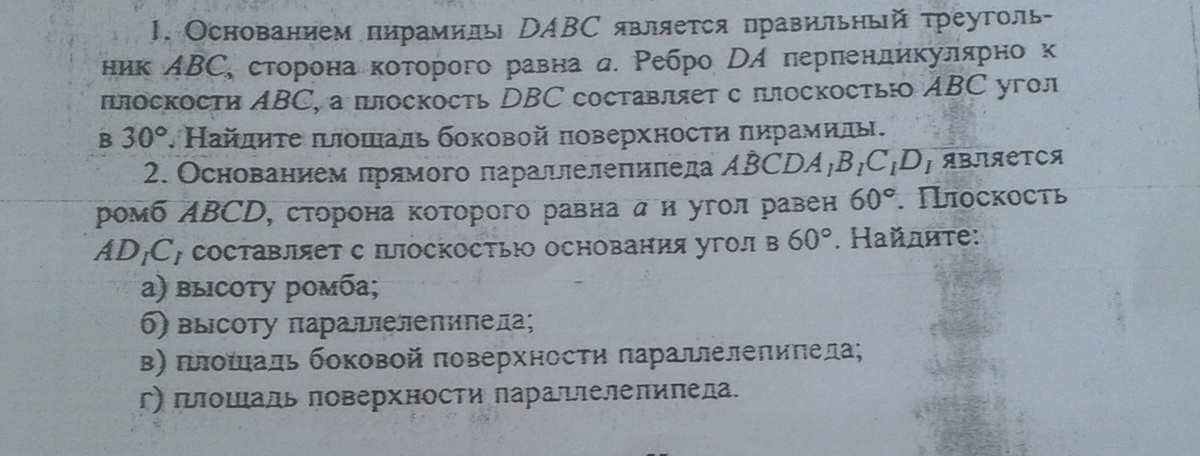 АК-перпендикуляр в правильном треугольнике и он равен (а*корен3/2)соs30=АК/КД. КД=АК/соs30=а. Сл-но АД=а/2. S(ADC)=S(DAB)=1/2a*a=a^2/2. S(DCB)=1/2*a*a a^2/2S(бок)=2*a^2/2+a^2/2=a^2
