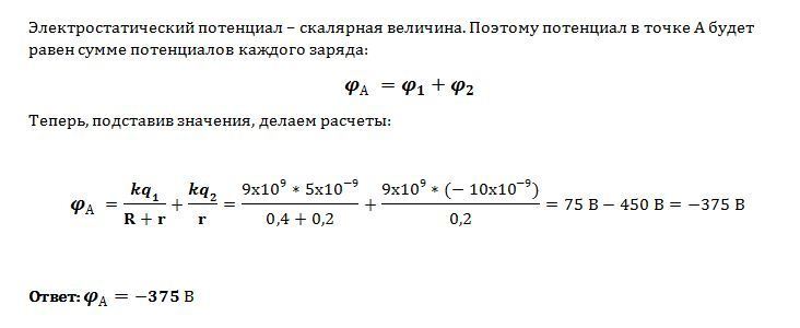 два шарика с зарядами q1=5 нкл q2=-10 нкл находятся на расстояние r1= 40 см друг от друга.Чему равен потенциал поля этих зарядов в точке А,находящейся на прямой,соединяющей оба заряда, и справа от заряда q2 на расстоянии 20 см от него