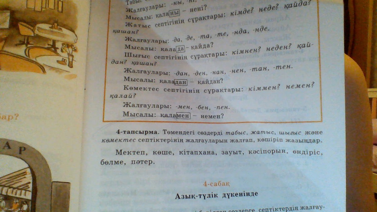 томендегы создерды табыс жатыс шыхыс жэне комектес септыктерынын жалхауларын жалхап кошырып жазындар слова мектеп кеше кытапхана зауыт кэсыпорын ондырыс болме пэтер помогите пож извените что так напесала просто нет клавиатуры есле комуто будет легче я в 5 классе учебник казахского 2010 год стр 67 4 номер прошу
