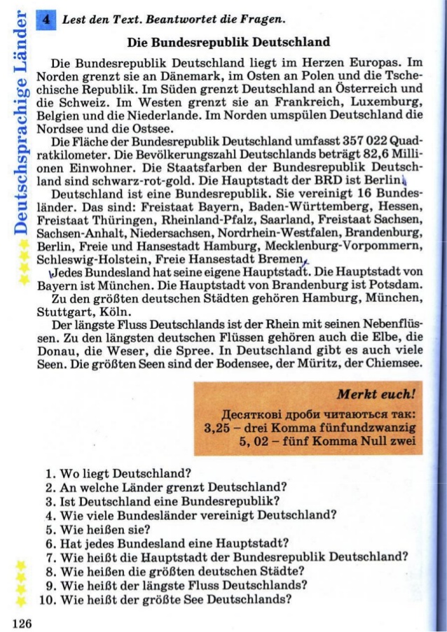 Федеративная республика Германия расположена в самом сердце Европы. На севере она граничит с Данией, на востоке с Польшей и Чешкой Республикой. На юге Германия граничит с Австрией и Швецией. На западе она граничит с Францией, Люксембургом, Бельгией и Нидерландами. На севере Германия омывается двумя морями - Северным и Балтийским. Площадь Федеративной Республики Германия охватывает 357 002 кв. км. Население Германии составляет 82, 6 миллионов жителей. Государственные цвета ФРГ - черно-красно-желтый. Столица ФРГ - Берлин. Германия - Федеративная Республика. Она объединяет 16 Федеративных стран. Это - Свободное государство Бавария, земля Баден-Вюртенбург, Гессен, Свободное государство Тюрингия, земля Рейнланд-Пфальц, Саарланд, свободное государство Саксония, Саксония-Анхальт, Нижняя Саксония, Северная Рейн-Вестфалия, Бранденбург, Берлин, Свободный и Ганзенский город Гамбург, Мекленбург-Передняя Померания, Шлесвиг-Гольштейн, Вольный ганзейский город Бремен. Каждая федеративная страна имеет свою столицу. Столица Баварии - Мюнхен. Столица Бранденбурга - Потсдам. К самым большим городам Германии принадлежат - Гамбург, Мюнхен, Штутгарт и Кёльн. Самая длинная река в Германии - Рейн и его притоки. К самым длинным немецким рекам принадлежат - Эльба, Дунай, Везер, Шпрее. Так же, в Германии много озер. Самые большие озера - Боденское озеро, Мюриц и Кимзе.