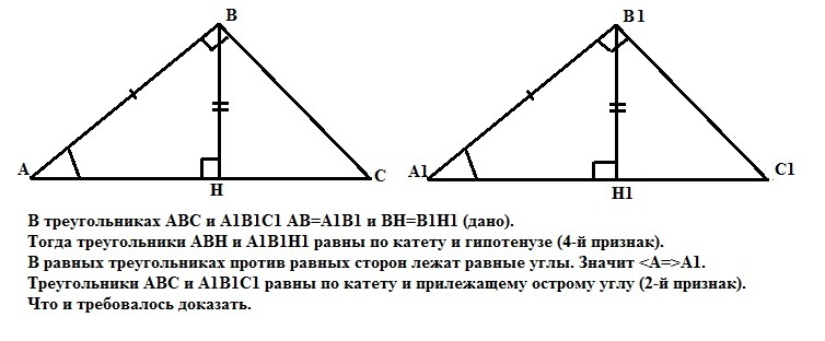 Тогда треугольники АВН и А1В1Н1 равны по катету и гипотенузе (4-й признак).