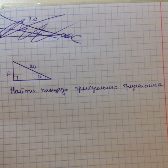 площадь прямоугольного треугольника равна половине произведения катетов. Соответственно, по теореме пифагора : из 20^2-10^2=корень из 300.