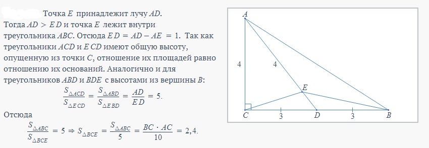 На прямой, содержащей медиану AD прямоугольного треугольника ABC с прямым углом C, взята точка E, удаленная от вершины A на расстояние, равное 4. Найдите площадь треугольника BCE, если BC=6, AC=4. В ответе укажите максимальную такую площадь