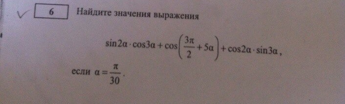 sin2 alpha cdot cos3 alpha +cos(frac{3pi }{2}+5 alpha )+cos2 alpha cdot sin3 alpha =\\=(sin2 alpha cdot cos3 alpha +cos2 alpha cdot sin3 alpha )+sin5 alpha =sin(2 alpha +3 alpha )+sin5 alpha =\\=sin5 alpha +sin5 alpha=2sin5 alpha =2sin(5cdot frac{pi}{30})=2sinfrac{pi}{6}=2cdot frac{1}{2}=1