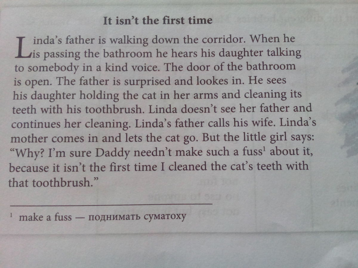 Папа Линды идет по коридору. Когда он проходит мимо ванной комнаты, он слышит, как его дочь поговорит по телефону с кем-то милым голосом. Дверь в ванную комнату открыта. Папа удивляется и заглядывает. Он видит, как его дочь держит кошку в руках и чистит ее зубы с зубной щеткой. Линда не замечает папу и продолжает ее чистить. Папа Линды позвал его жену. Мама Линды пришла и отпустила кошку. Но маленькая девочка сказала :"Почему? Я уверена, папочке не стоило поднимать суматоху насчет этого, потому что это первый раз, когда я чищу кошачьи зубы с той щеткой."