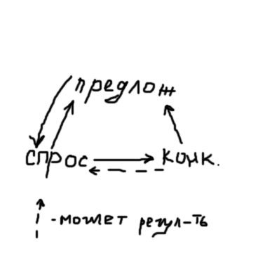 Предложение зависит от спроса(спрос формирует предложение) , спрос контролирует конкуренцию, конкуренция регулирует предложение.