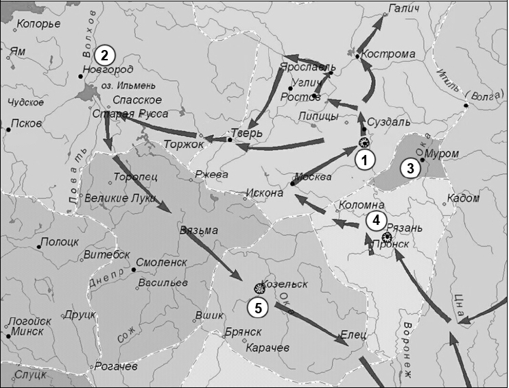 5) в результате событий, обозначенных на схеме, русские земли попали в