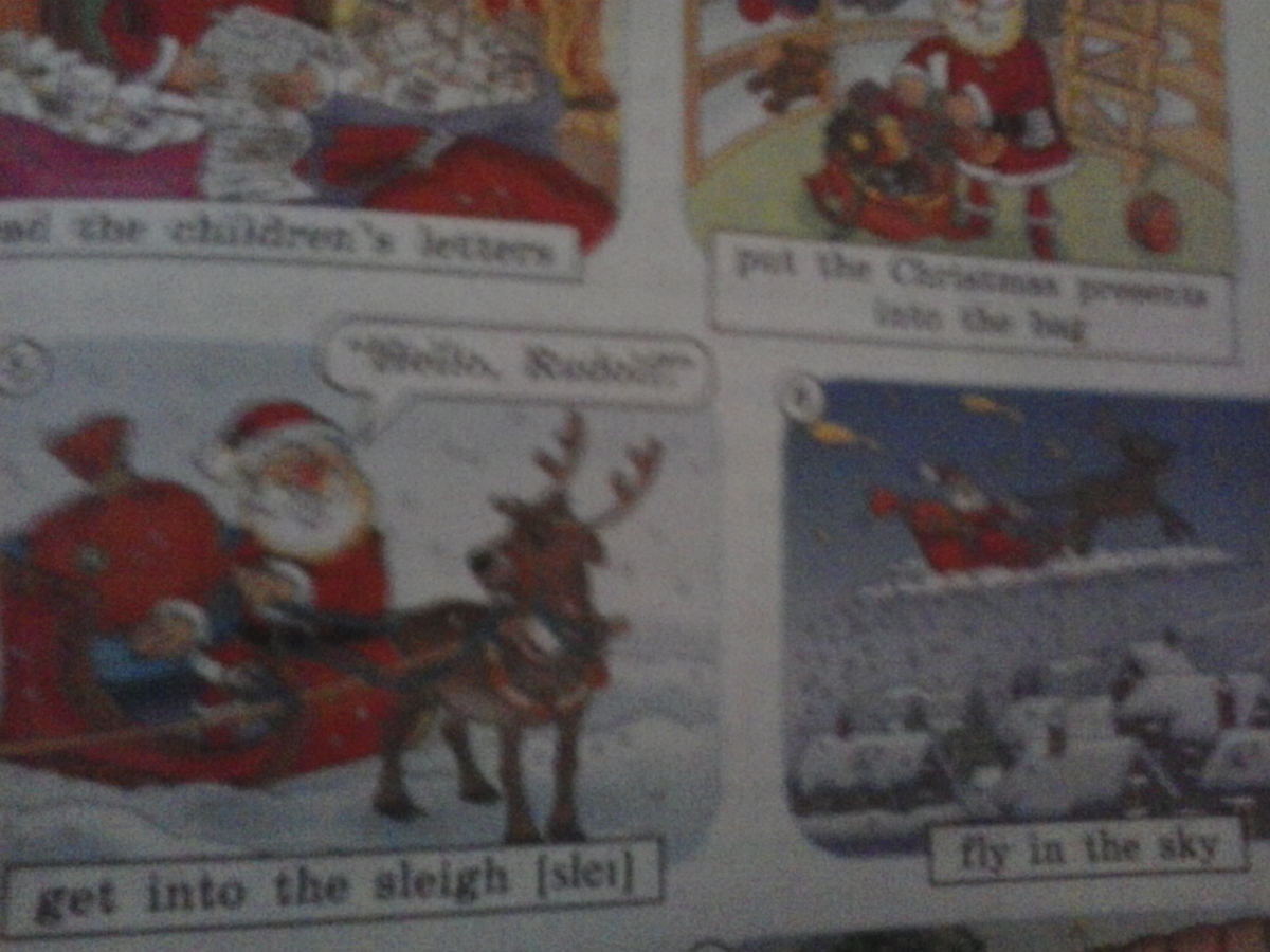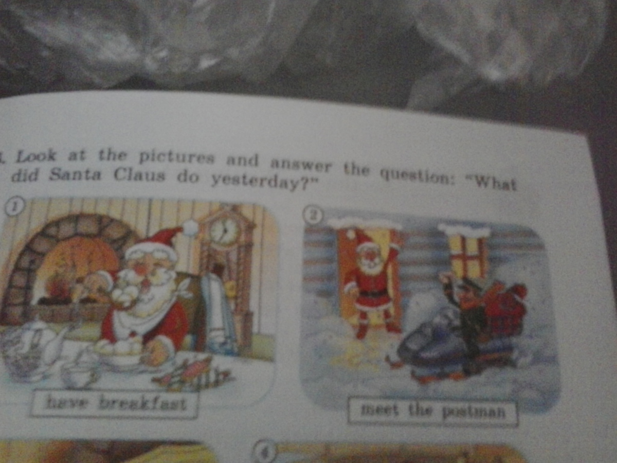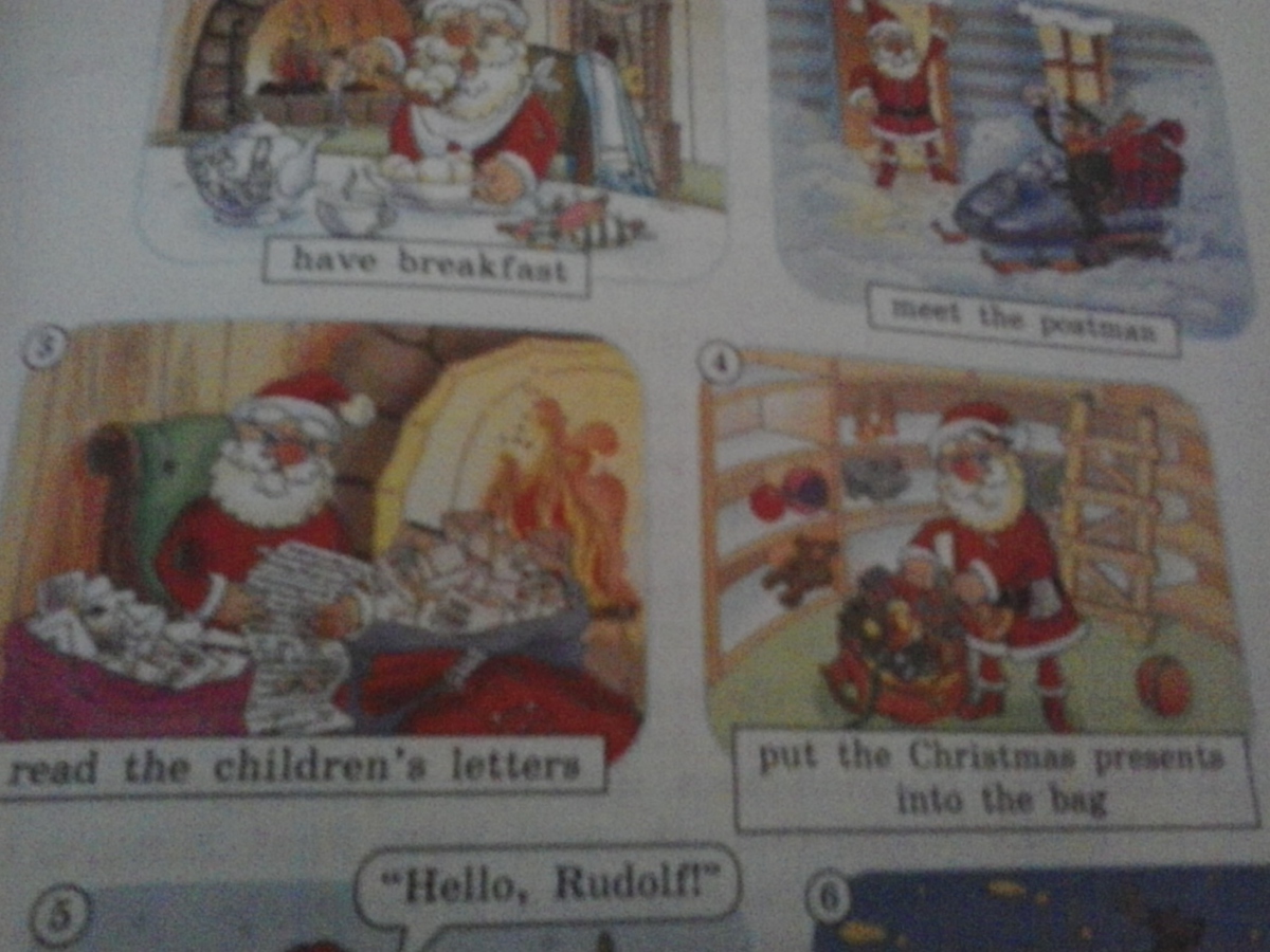 Yesterday, Santa Claus had breakfast, met the poatman, read the children's letters, put the Christmas presents into the bag, got into the sleigh and flew in the sky. sorry for the errors)))