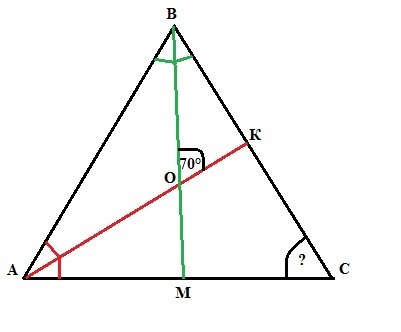 в треугольнике АВС биссектрисы АК и ВМ пересекаются в точке О . Найдите угол С треугольника, если угол КОВ = 70 градуса