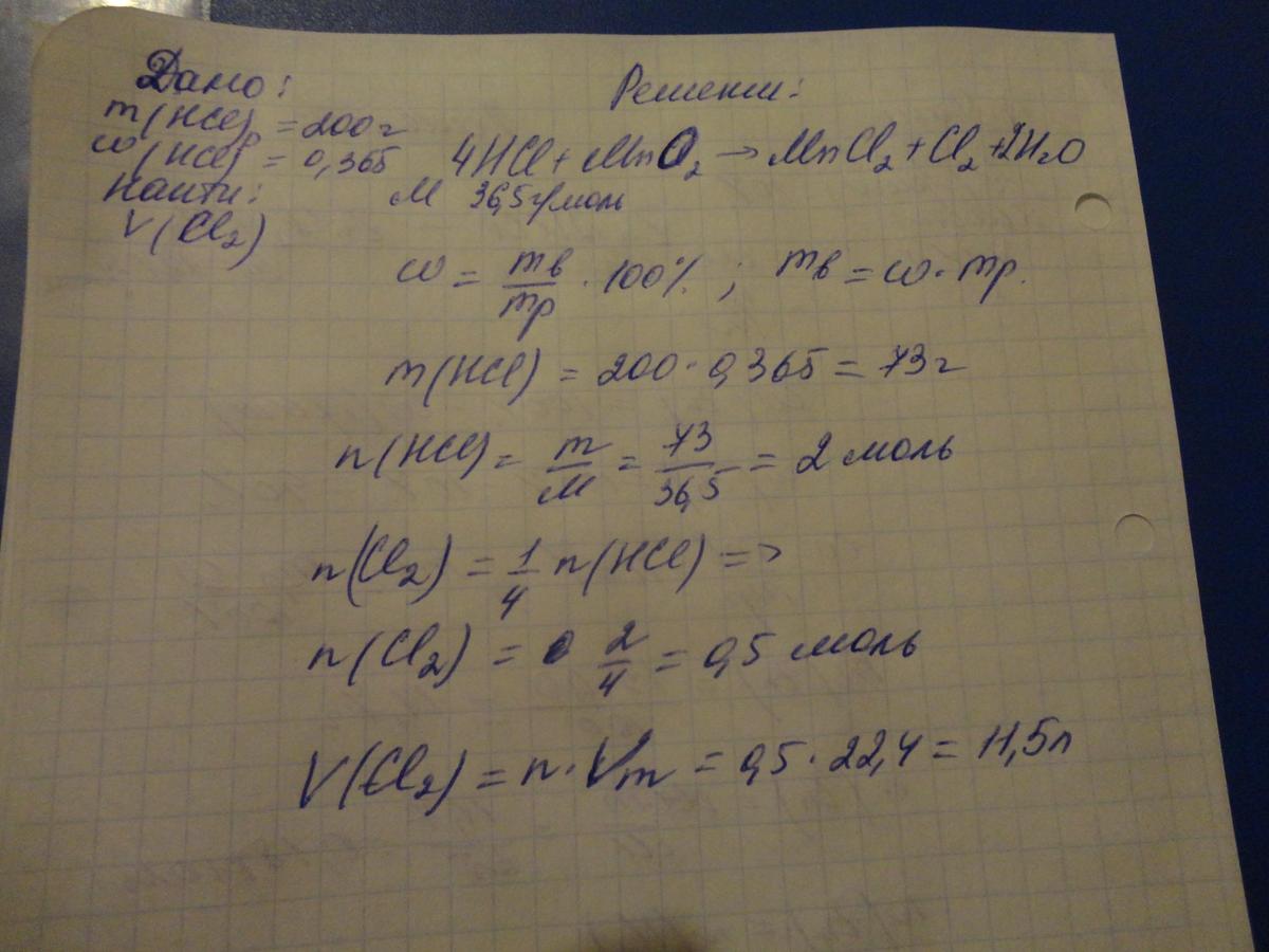 рассчитайте,какой объем хлора выделится при взаимодействии соляной кислоты с оксидом марганца (IV),если известно ,что в реакцию вступило 200 г раствора кислоты с массовой долей HCl 0,365